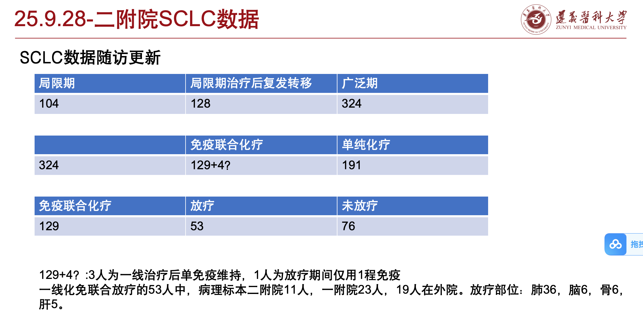 下周计划: 1.SCLC下一步:1.针对这53人进一步确认疗效评价,是否有远隔效应,记录放疗前后SLD。 2.组学:FFPE样本 1)普通转录组:870/样,取样失败需承担取样费240/样(厚度在5-10um,组织面积大于25mm的切片12张) 2)WES:900/样((200x)20G)(厚度在 5-10um,含组织面积大于 25mm的切片6张) 3)单细胞flex: 样本要求是手术样本蜡块切片,穿刺组织细胞太少(一条大约5w细胞) 血液样本 1)外泌体rna-seq: small 2300/样, lnc 4000/样。